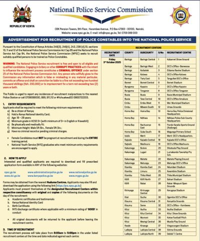 Service Act Cap 84, the National Police Service Commission (NPSC) seeks to recruit suitably qualified persons to be trained as Police Constables.